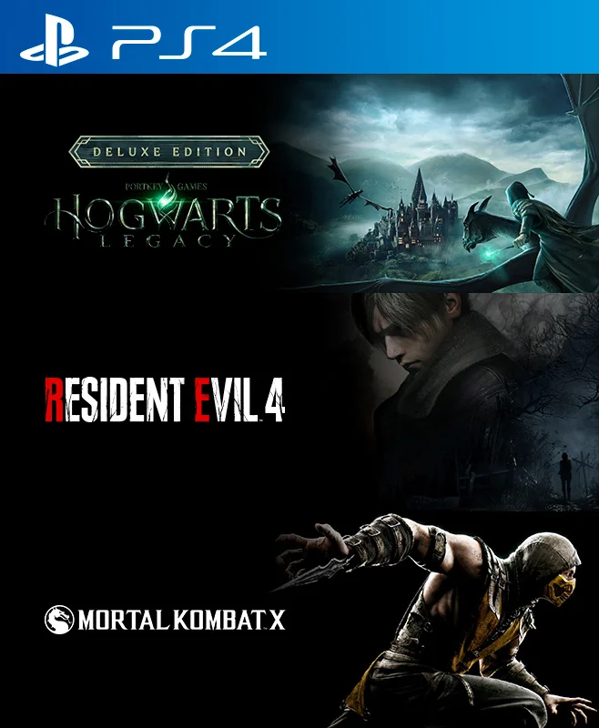3 Juegos en 1 Hogwarts Legacy Digital Deluxe Edition mas Resident Evil 4 Remake mas Mortal Kombat X PS4
