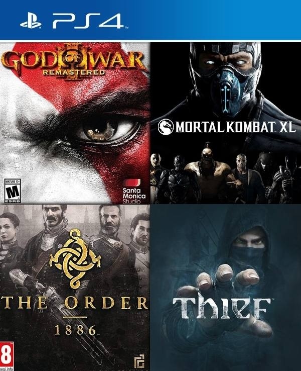 4 JUEGOS EN 1 Mortal Kombat XL MAS God of War III Remastered MAS THIEF The Order 1886 PS4
