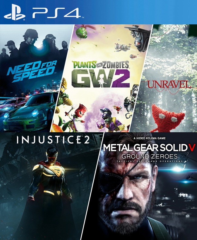 5 JUEGOS EN 1 Injustice 2 mas Metal Gear Solid V ground Zeroes mas Need for Speed mas Plants of Zombies GW2 mas Unravel PS4